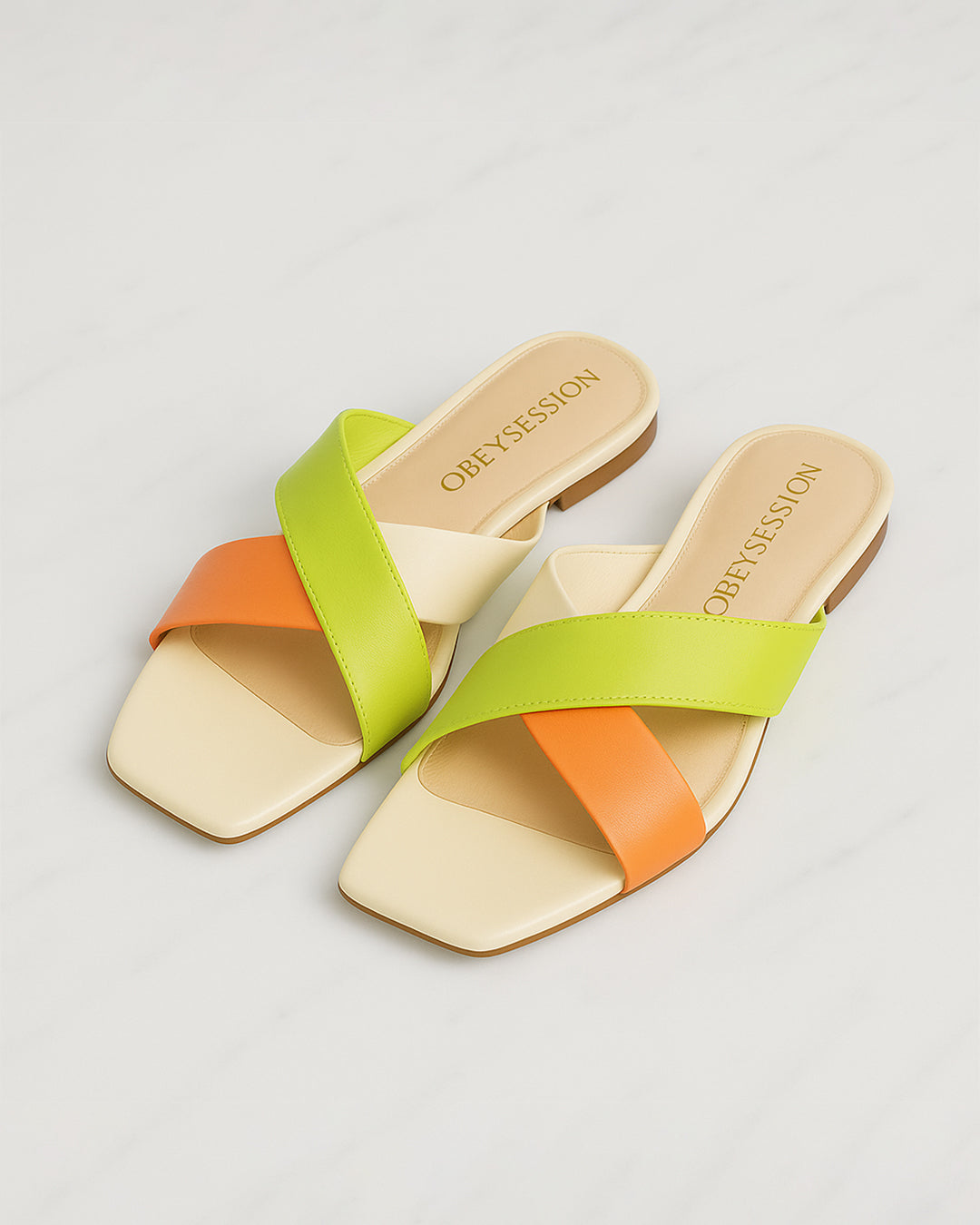 With citrus tones of lime and orange crossing over ivory, Alba is a flat slide that brings brightness to every step. Minimal yet bold, it carries the rhythm of Mediterranean mornings and summer streets.
