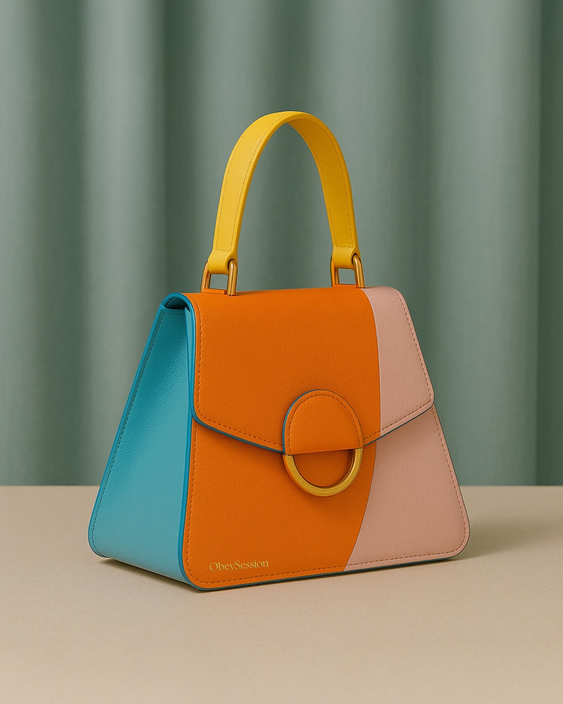 Croma di Sole is a sunbeam held in structure. An asymmetric blend of saffron orange, blush nude, and Aegean teal—framed by a radiant yellow top handle and signature circular ring closure. Sculpted, cheerful, and self-assured.