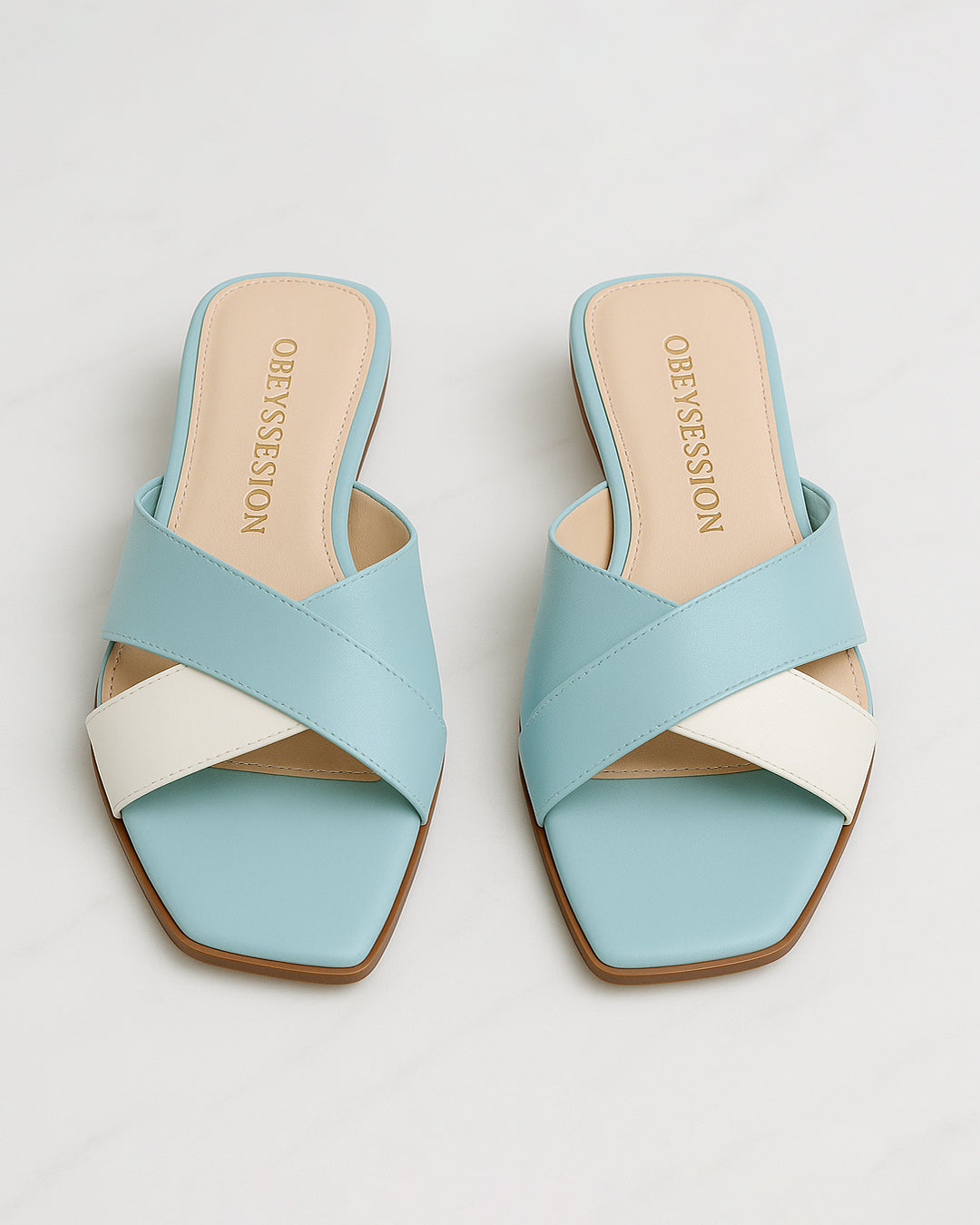 In soft sky blue and ivory, Gaia is a flat crisscross slide that captures the calm of open skies and summer air. With its squared toe and clean geometry, it brings lightness and harmony to everyday steps.