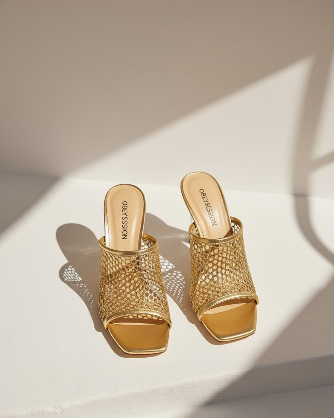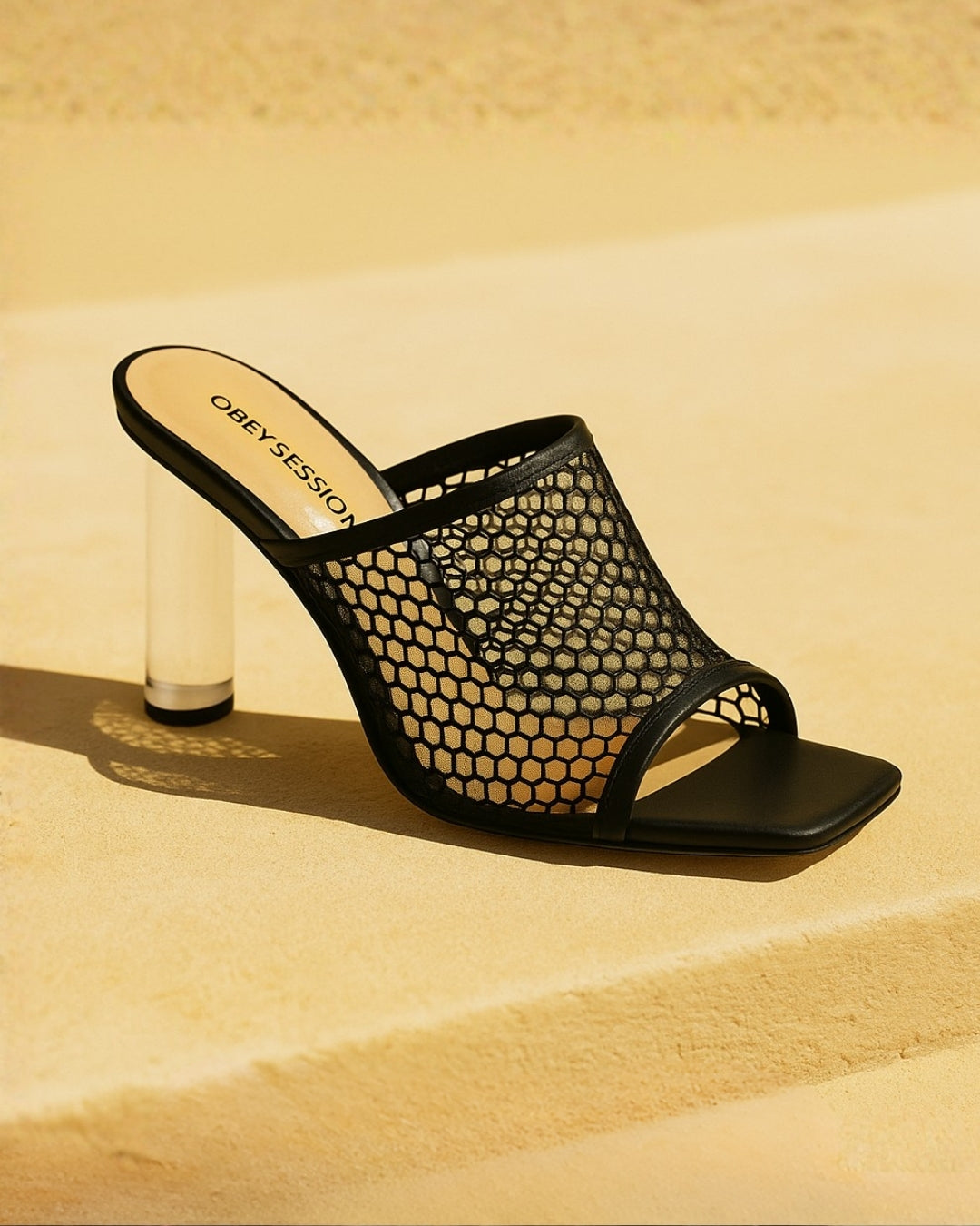 The hexagonal mesh upper reveals and conceals in equal measure, wrapping the foot in a precise architectural grid. Framed by smooth Obsidian Nappa, the structure feels deliberate, sculptural, and intentional. The cylindrical transparent heel creates the illusion of suspension, grounding the design while allowing light to pass through.