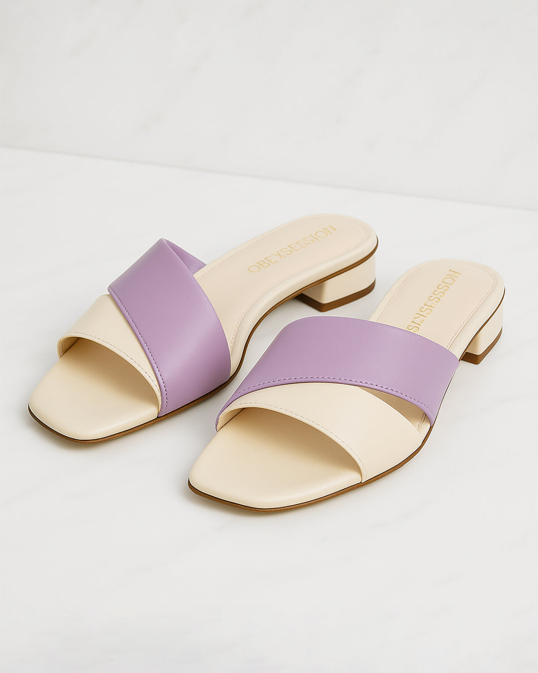Lavender and ivory meet in Iris, a flat slide that carries ease and freshness. With its squared toe and clean dual strap, it is a modern companion for days that flow from city streets to seaside terraces.