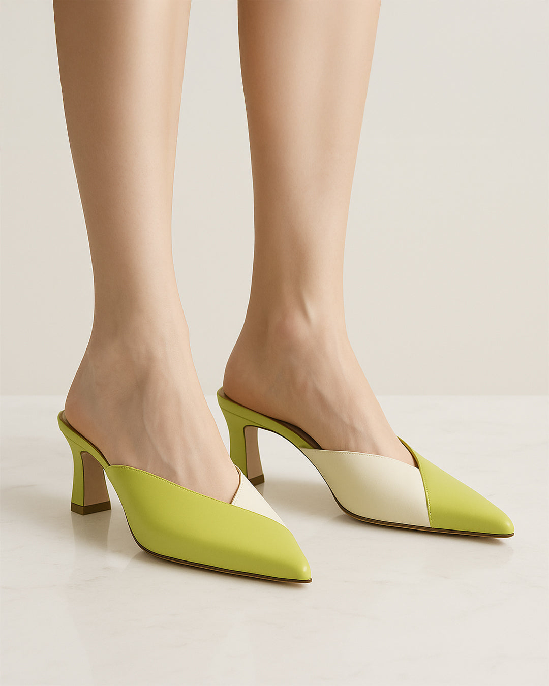 A slender silhouette in lime green and ivory, Liora redefines elegance with its curved mid-heel and pointed toe. Light, graceful, and designed for evenings when subtlety makes the strongest statement.