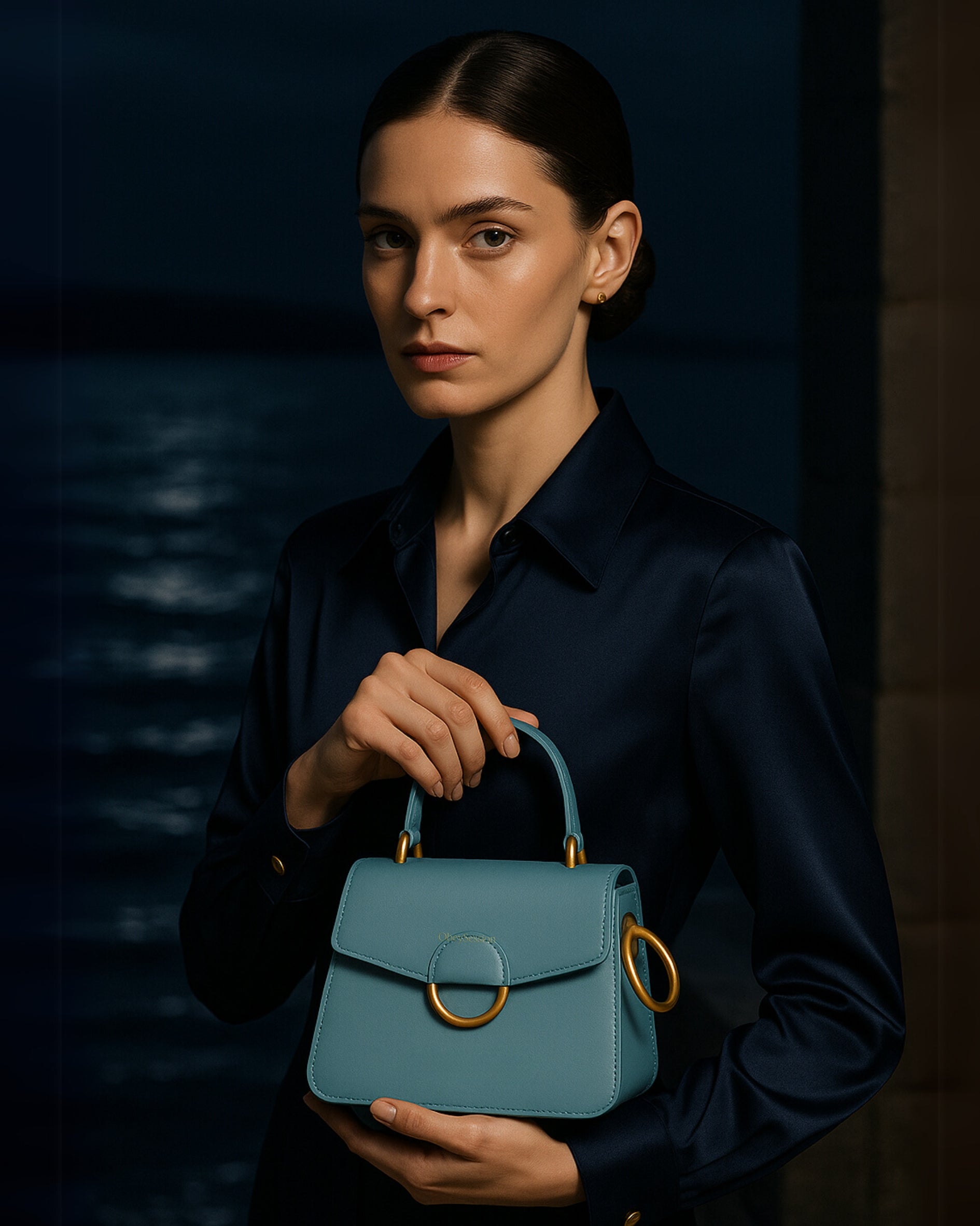 Luna Mare 95 evokes a tide washing over polished gold — calm, precise, and quietly powerful. Its compact structure in matte seafoam blue is elevated by signature brushed gold rings and a clean architectural flap.