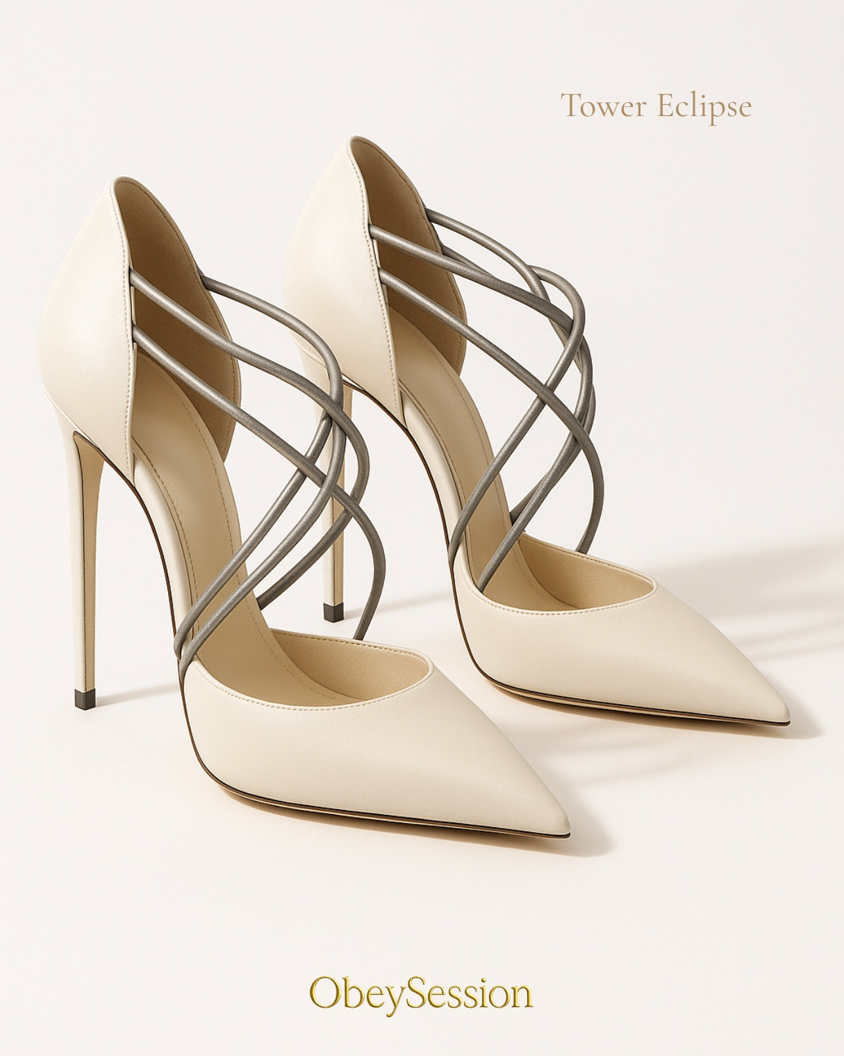 An architectural silhouette born beneath London’s bridges. The Tower Eclipse 105 stiletto reimagines structure as sensuality — ivory leather panels rise into sculpted arcs of champagne metallic straps, echoing the geometry of Tower Bridge itself.