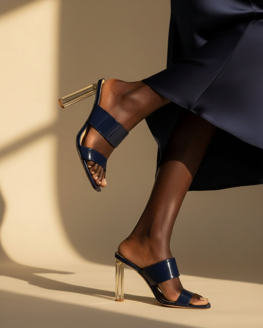The composition is minimal yet commanding. Clean lines, deliberate spacing, and a strong vertical heel transform the mule into a statement of balance and intent. The result is fluid elegance with architectural resolve.