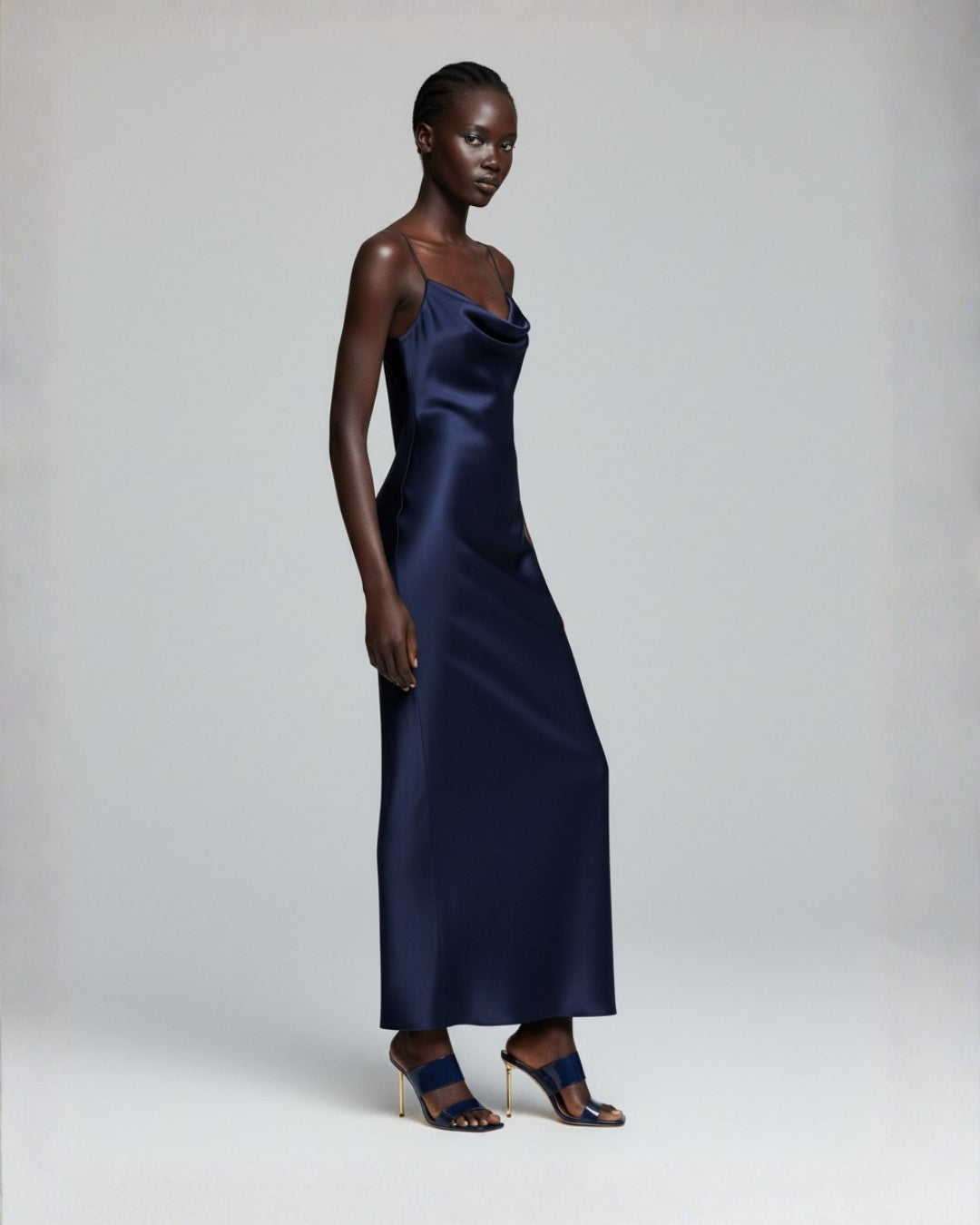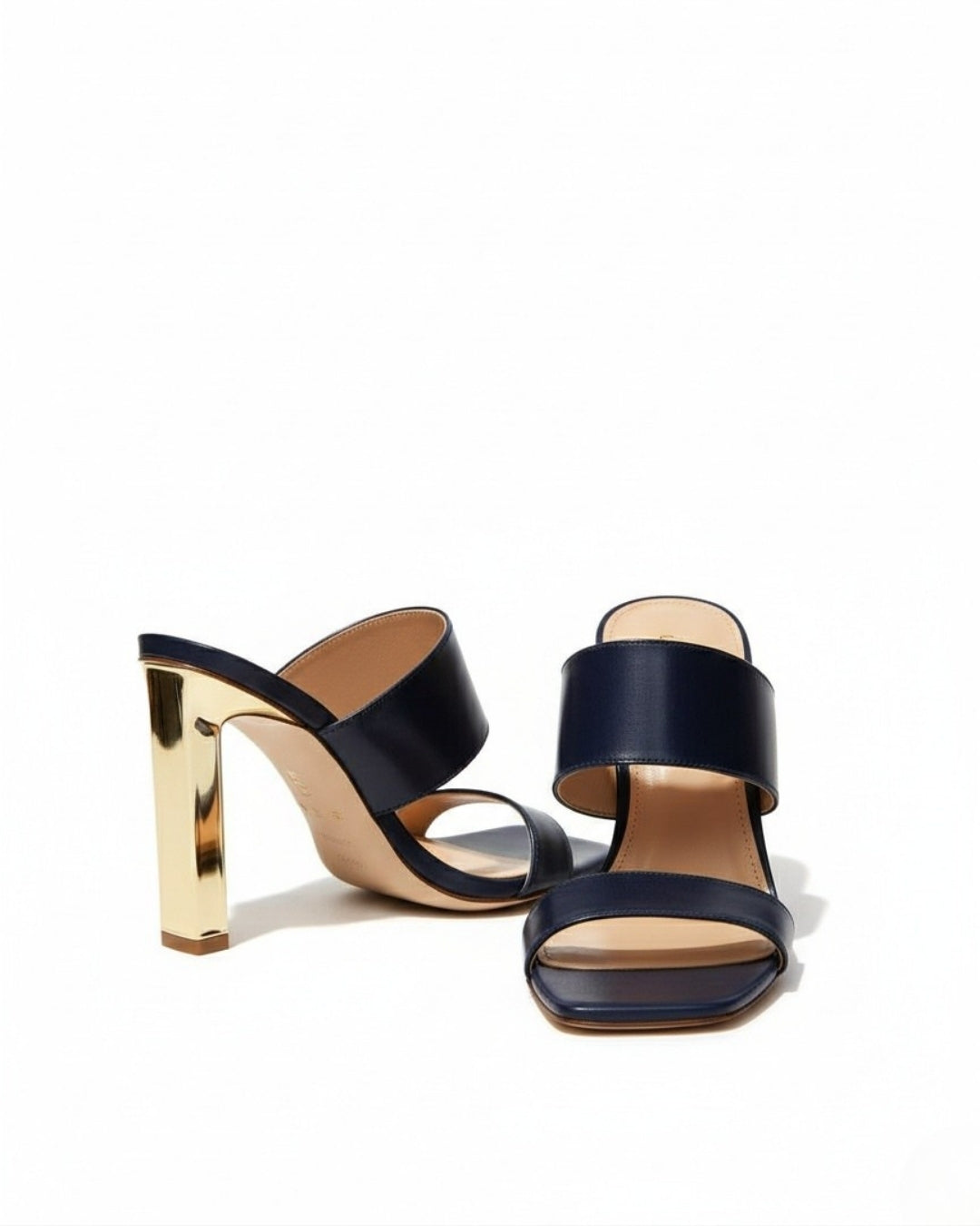 Orbit Sling – Solar Gold is a controlled expression of contrast. Deep navy leather straps orbit the foot with precision, grounded by a sculptural metallic heel that adds weight, reflection, and authority.
