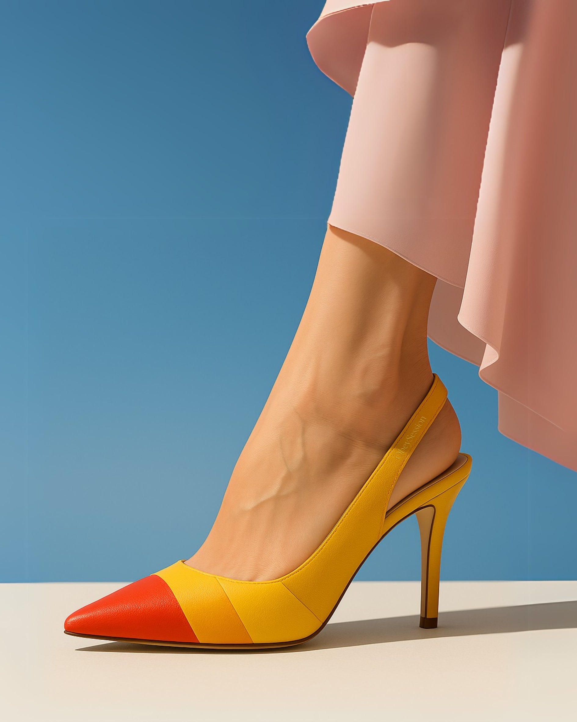 Soleil Prism 105 captures the fractured brilliance of Mediterranean sunrises. With sharply sculpted lines and radiant segments in saffron yellow, amber, and poppy red, this pointed stiletto is a statement in architectural glamour.